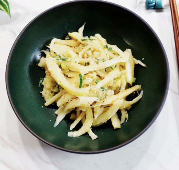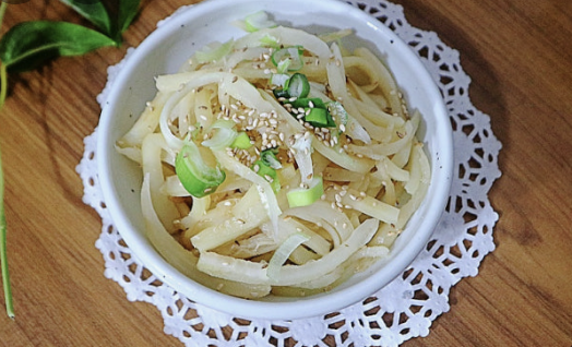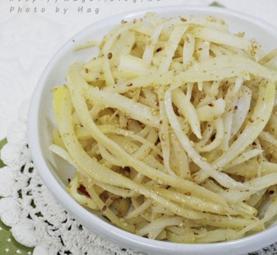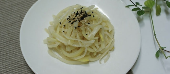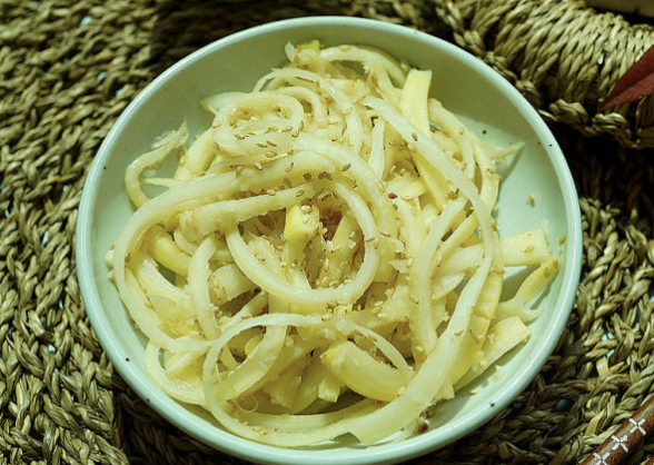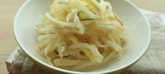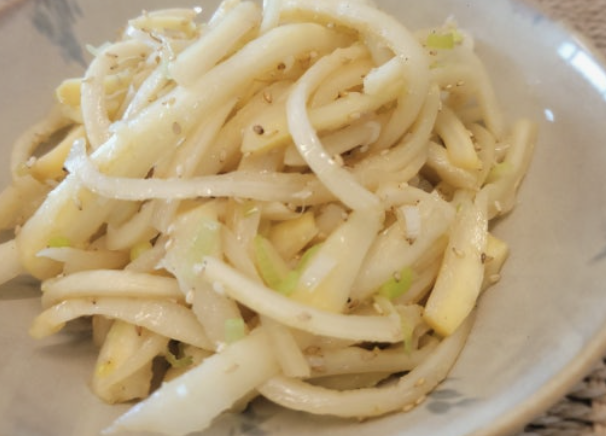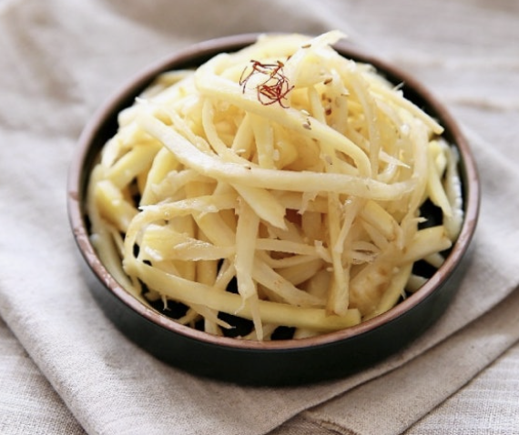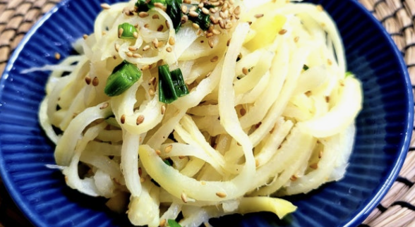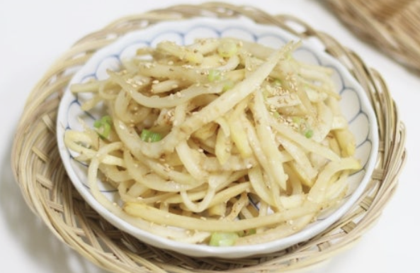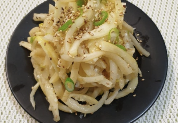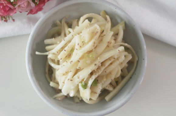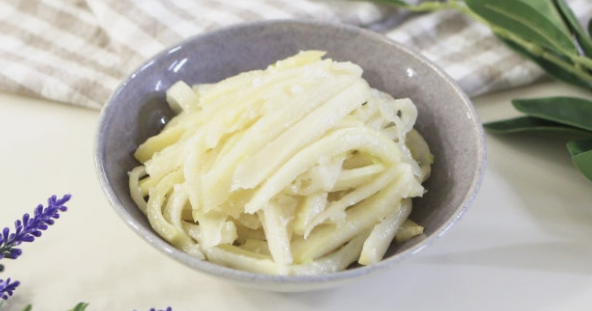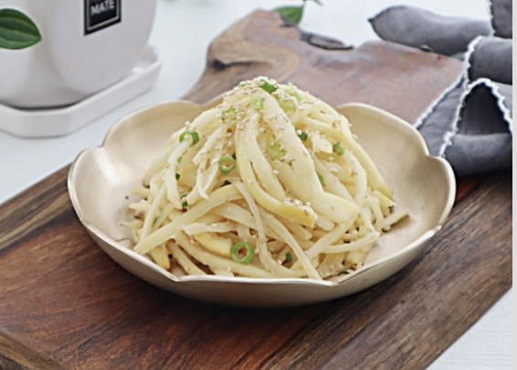 A. 도라지를 가늘게 찢어주세요. 가위로 세로로 쭉쭉 잘라도 좋아요. 씹는 맛이 훨씬 부드러워집니다.
