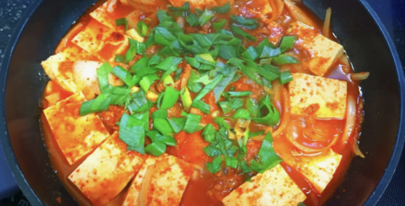 물기 제거 없이 썰어 놓은 두부를 팬에 올리고 대파를 뿌린 뒤 양념을 골고루 뿌려 중불에서 가열하면 완성이에요. 급할 때는 이렇게!