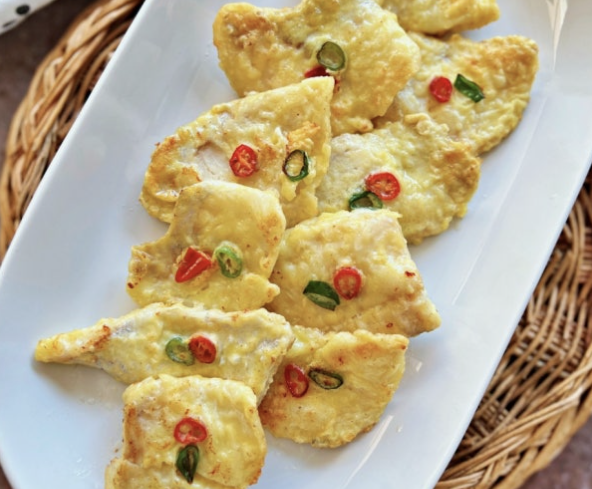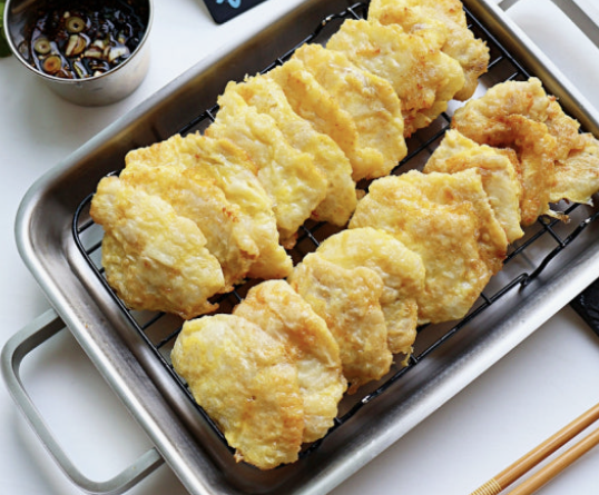 명절 상차림에 빠지지 않는 대표 전이죠. 동태포에 소금과 후추로 밑간하고 밀가루와 계란옷을 입혀 부치면 돼요. 핵심은 핏물을 키친타월로 완전히 제거하는 거예요.