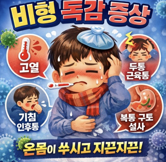 B형 독감은 소화기 증상을 자주 동반해요. 발열까지 겹친다면 꼭 독감 검사를 받아보세요.